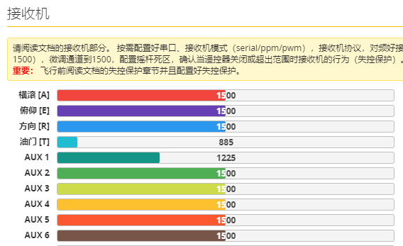 4、在接收机界面中,检查遥控器各通道及行程设置是否正确,检查遥控器摇杆有无问题。