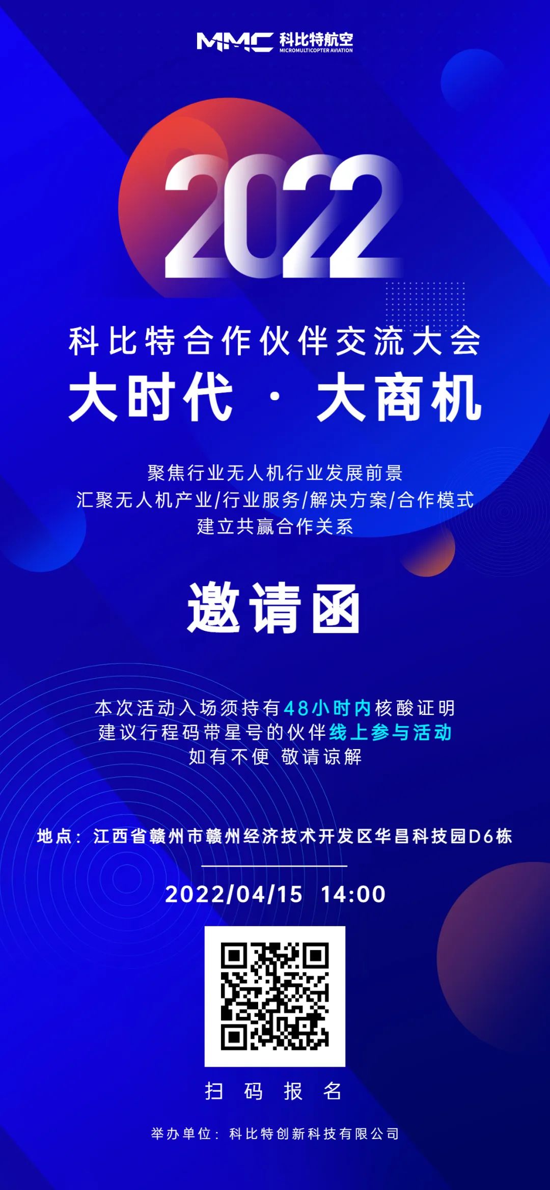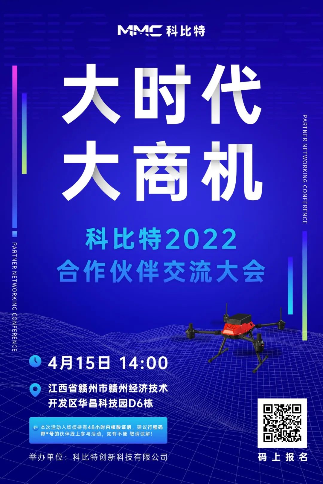 科比特航空2022年度峰会——科比特产业合作伙伴大会赣州站,首站将于4月15日在江西省赣州市赣州经济技术开发区华昌科技园(科比特航空公司)拉开帷幕,其后陆续将在重庆、兰州、呼和浩特等城市举办。本次峰会将以“大时代,大商机”为主题向各个行业领域的合作伙伴发出邀请,共同围绕智能产业、智慧城市经济、共赢合作模式等主题开展深入研讨,探讨无人机产业发展新模式、新路径,交流无人机在智慧城市应用的新方向、新思路。近两年 ,科比特在全国各地举办的合作伙伴大会影响力不断提升,成为工业级无人机行业极具影响力的无人机应用大会,吸引了众多的合作伙伴、终端用户、生态开发者、政府机构参与,备受瞩目。2022年科比特将继续携手合作伙伴构建全新无人机产业生态,搭建相互合作的桥梁,合作行业更丰富,合作场景更细化,涉及合作领域更广,为合作伙伴打开更广阔的价值空间。科比特航空诚邀广大合作伙伴踊跃扫码报名参加!