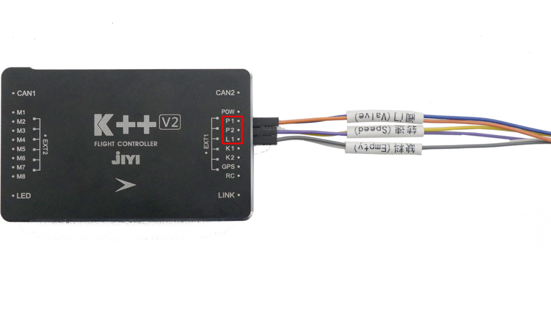 2、将阀门线束接在飞控P1通道、转速线束接在P2通道、缺料信号线接在L1通道,本文以PWM模式为例,CAN线束不用连接。