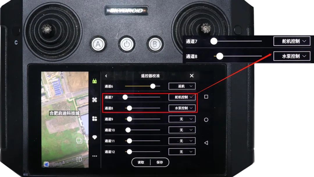 5、打开遥控器中飞防管家APP, 在通道设置中,将通道7设置为舵机控制、通道8设置为水泵控制。