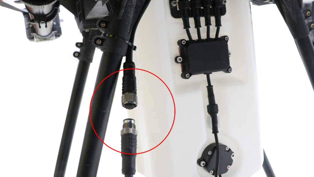 4、连接播撒器时,将播撒器连接线的螺纹头与飞控连接线的螺纹头对接后拧紧即可。