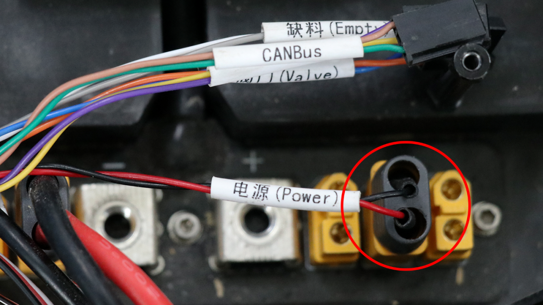 1、将飞控连接线上的电源线束接在分电板XT60母头上。