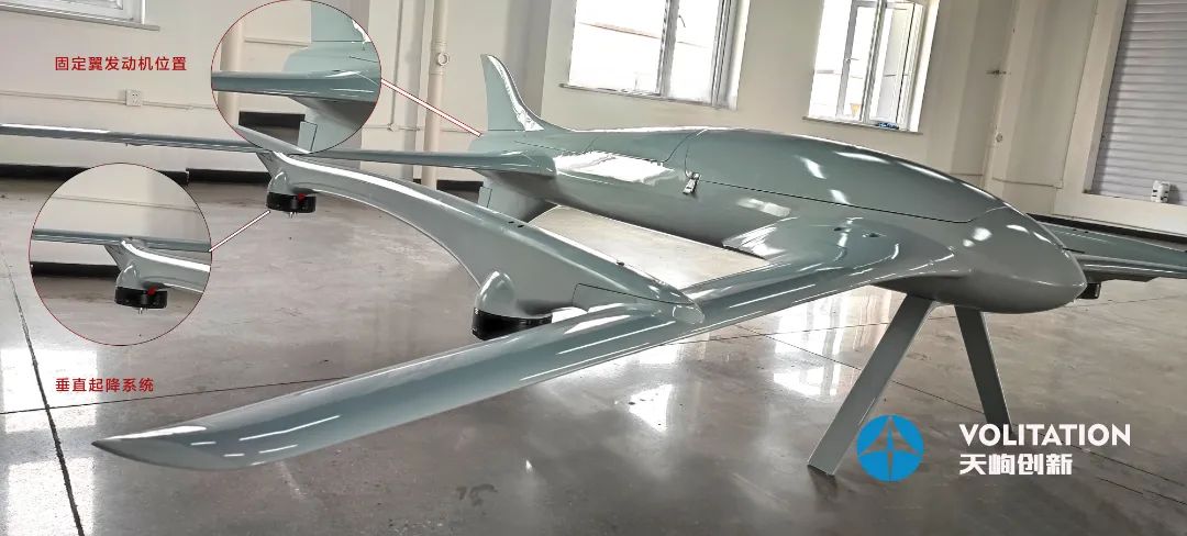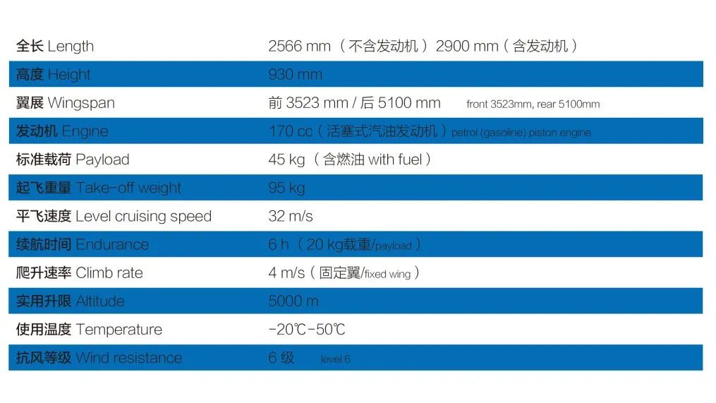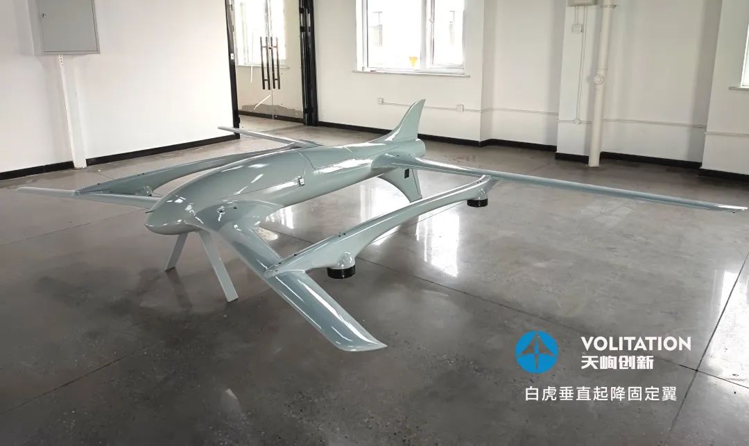 天峋自研成熟货架产品白虎垂直起降固定翼,起飞重量95公斤,载重45公斤(含燃油),航时6小时(载20公斤),航程700公里。