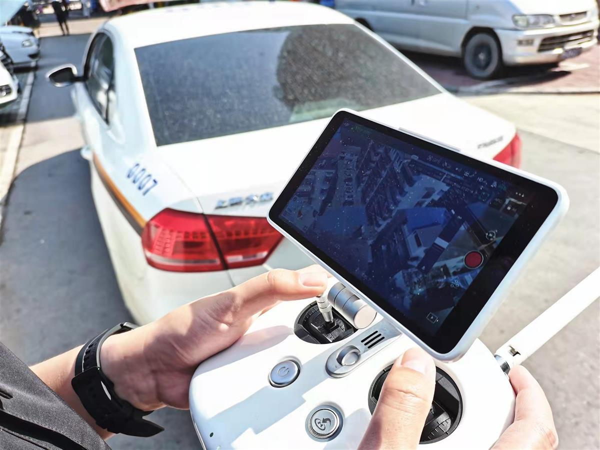 在静态管控区的小区内,随着民警熟练操控,一架警用无人机腾空而起并在空中移动,小区道路、进出口环境等画面实时传回到民警手机。