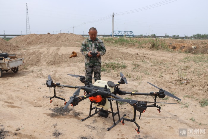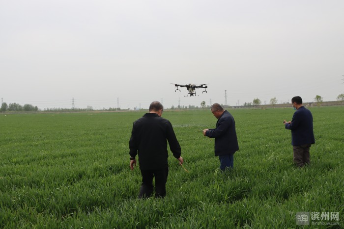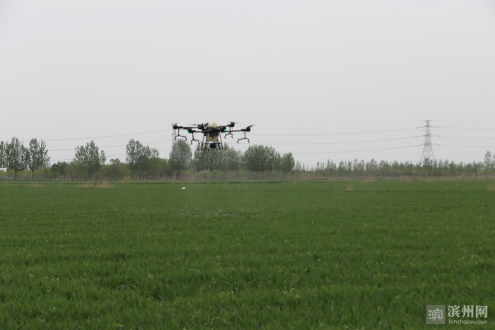 滨州日报/滨州网沾化讯 “我家农场这1000亩小麦,全部统防统治,不但节省了大量人力物力财力,也提高了防治效果,为下步小麦丰产丰收打下了坚实基础。”4月22日,沾化区黄升镇程井村军浩家庭农场负责人张海军指着正在喷药的无人机说。