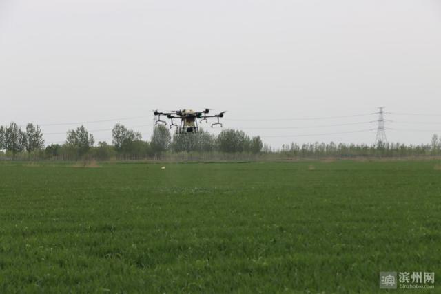 滨州日报/滨州网沾化讯 “我家农场这1000亩小麦,全部统防统治,不但节省了大量人力物力财力,也提高了防治效果,为下步小麦丰产丰收打下了坚实基础。”4月22日,沾化区黄升镇程井村军浩家庭农场负责人张海军指着正在喷药的无人机说。