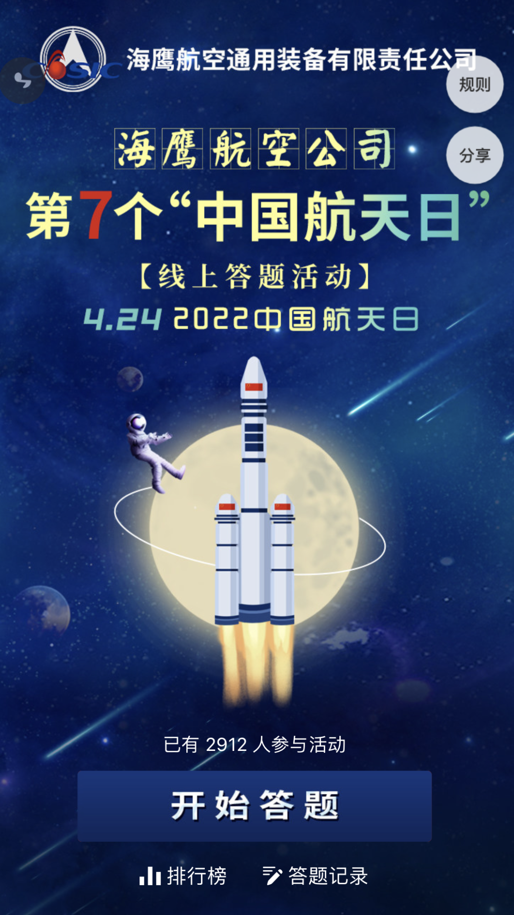 公司开展了“传承航天精神、推力天鹰翱翔”线上答题活动。题目涵盖航天精神、飞航精神、航天基础知识、公司2022年形势任务教育、公司品牌文化等内容,旨在进一步弘扬航天精神、聚力攻坚,推动公司无人机产业化高质量发展。