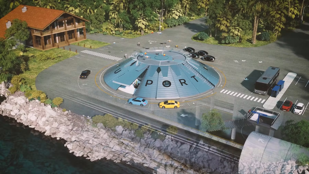 在等待过程中,城市航空港将向游客开放枢纽,让他们看看未来的城市航空旅行会是什么样子(屏幕上列出了出发的航班和它预计要接待的目的地)。该设施包括离网氢气eVTOL汽车充电站;一个高架起飞和降落平台;安全检查和乘客等候区;一个货运无人机区;以及为其零售品牌合作伙伴提供的空间。