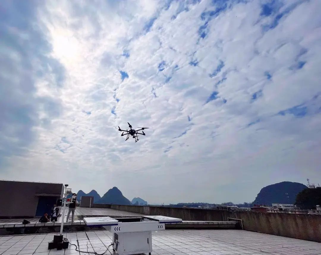 近日,在桂林,环保人员使用蜂巢智能无人巡检系统,无人机平台搭载环境监测设备对附近10km半径区域进行环境监测,从宏观上观测土壤、植被、水域和空气状况,并对水质、气体进行采样为环境保护提供决策依据。