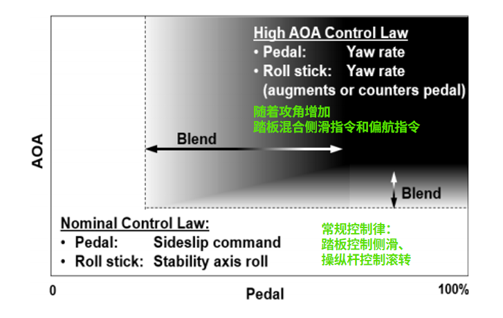 F-35在低中AOA攻角下的常规起飞控制律是大多数电传战斗机的典型方法:纵向杆在低速时控制俯仰角速率,在高速时控制纵向加速度;侧杆控制飞行轨迹上的滚转速率; 踏板控制侧滑。然而随着AOA攻角的增加,大踏板输入的方向性响应混合了侧滑指令和偏航速率指令。