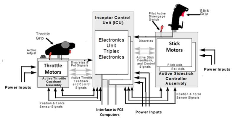 从系统架构的角度来看,用通用硬件来满足飞机的作战任务需求可以减少维护和供应链的需求。在驾驶舱内,实现这一共性的一个关键因素是对侧杆和油门的主动接收器的使用。如图所示的主动侧杆系统(AIS,Active Interceptor System), 允许控制律设计者将侧杆和油门的各种特性作为飞行阶段的函数进行编程,以满足每个版本的独特任务。