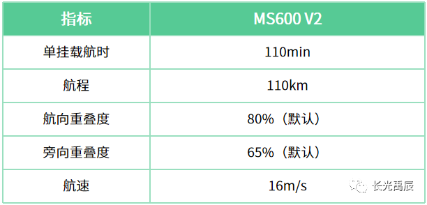 小型垂起固定翼遥感系统在进行MS600 V2多光谱相机单挂载时的飞行效率见如下表所示,飞行参数为默认飞行参数。