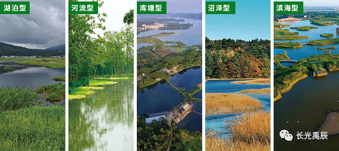 注:《湿地公约》中定义湿地是天然或人造、永久或暂时的死水或流水、淡水、微咸或咸水沼泽地、泥炭地或水域,包括低潮时水深不超过 6 m 的海水区。湿地类型可概括为:湖泊型、河流型、库塘型、沼泽型、滨海型五类。