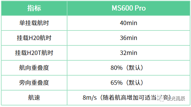 多旋翼遥感系统在进行MS600 Pro多光谱相机单挂载时的飞行效率如下表所示,飞行参数为默认飞行参数。