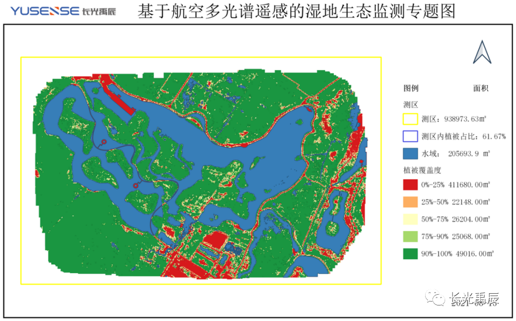 基于生成的二维正射影像,通过Yusense Map Plus多光谱数据行业应用软件进行湿地区域的植被覆盖度评估与水域提取,通过简单便捷的操作完成目标分析、识别及成果输出等一系列流程化处理,提高图斑判读的智能化与自动化水平。