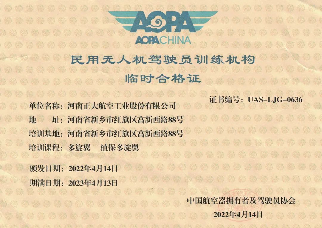 日前,正大航空获得了由中国 AOPA(中国航空器拥有者及驾驶员协会)颁发的《民用无人机驾驶员训练机构临时合格证》,此证的获得代表了正大航空正式拥有了培训无人机驾驶员、获取由中国民航局颁发的无人机驾驶员飞行执照的能力和资格。