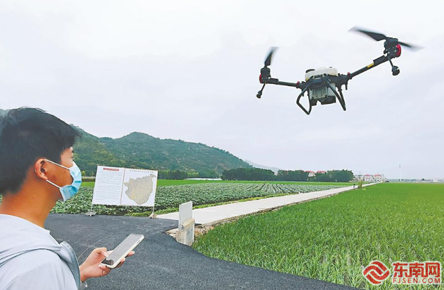台海网5月12日讯 据福建日报报道 10日,漳州市龙海区东园镇万亩现代农业示范区,一台农用无人机正在播洒农药,与以前传统一人一天喷药5亩相比,无人机具有精准喷洒、高密度雾化等优点,10小时可播洒300亩农药。据介绍,东园镇鼓励蔬菜种植基地组建无人机团队,不断提升科技助农效应。(福建日报记者 王毅 通讯员 洪骏潘依 摄)