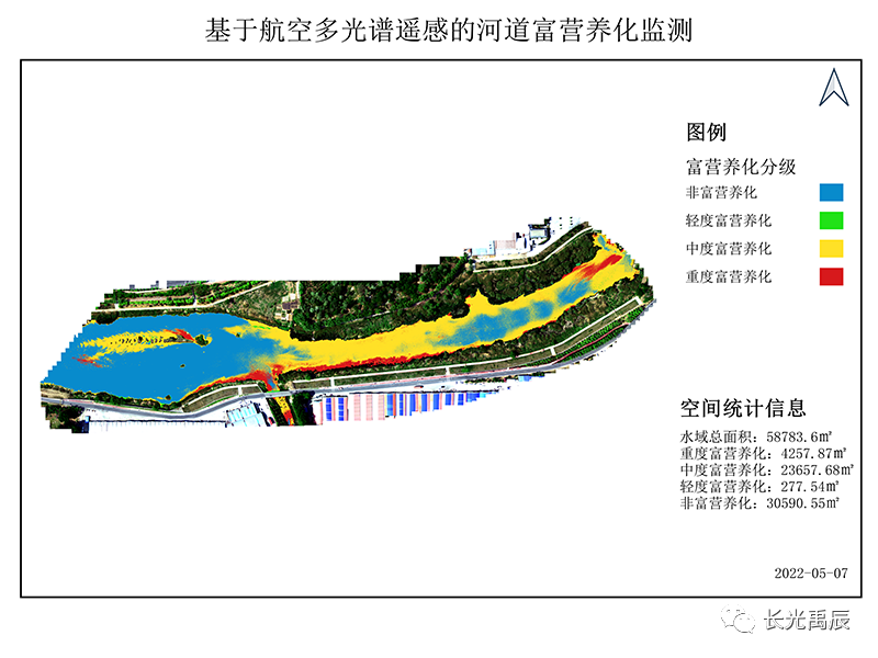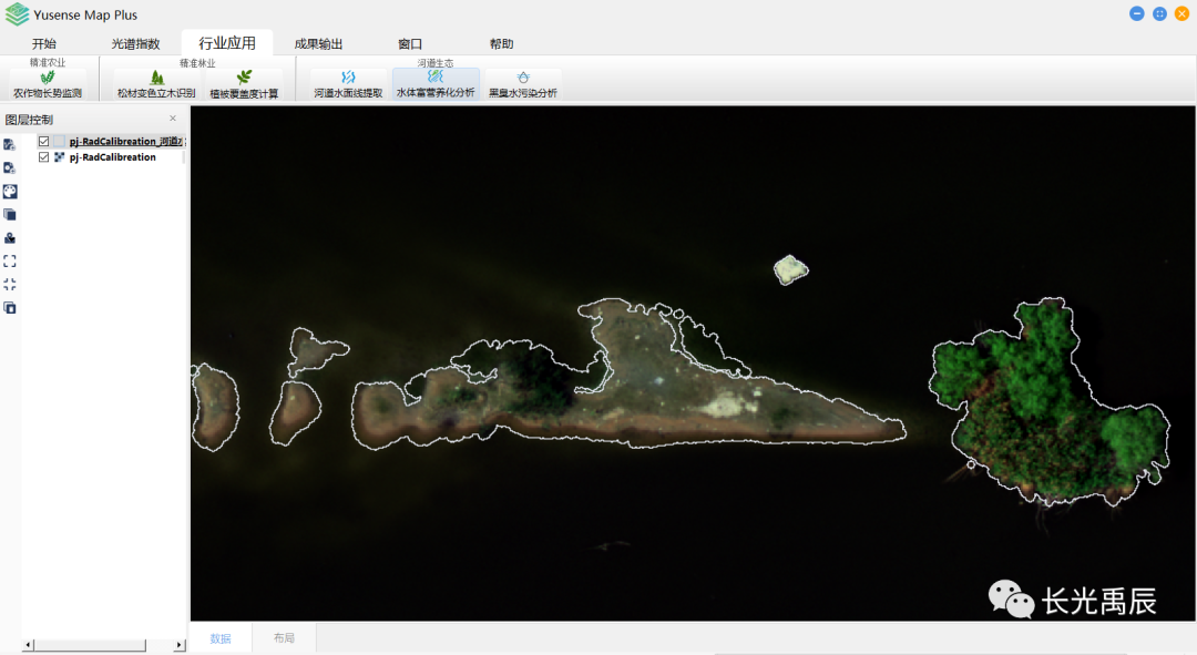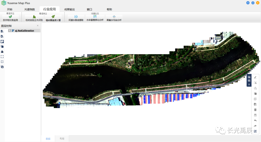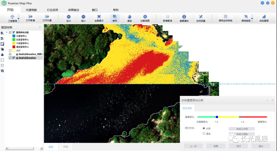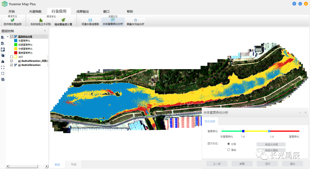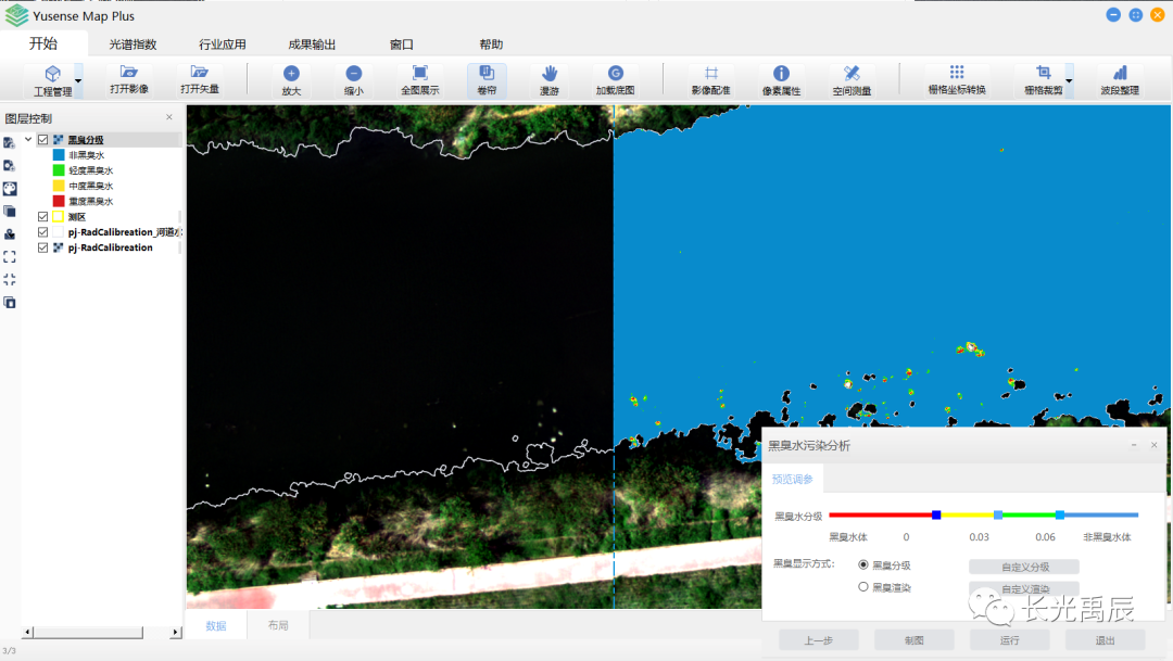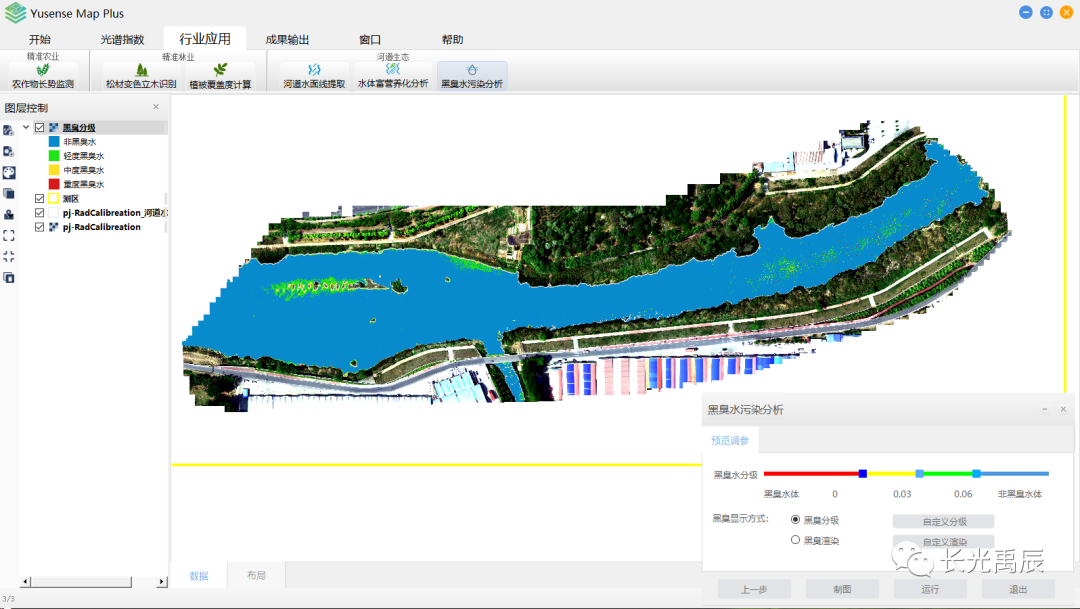 将拼接完成后的影像导入Yusense Map Plus中执行水面线提取、水体富营养化与黑臭水污染反演,软件通过将反演模型以算法模块的方式封装,用户通过简单交互即可完成成果反演,应用高效率,使用低门槛。