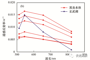 水体在遭受富营养化污染与黑臭污染后,相较于正常水体会产生较大的光谱反射差异,尤其在760nm~1000nm的不可见光波段范围内会呈现明显的光谱反射特征。