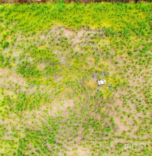 5月18日,在江西省宜春市上高县翰堂镇密村百亩早稻田中,一架无人飞机在技术人员的操控下,缓缓升到麦田上空,开展飞防作业,将药物均匀地喷洒到水稻叶面上。