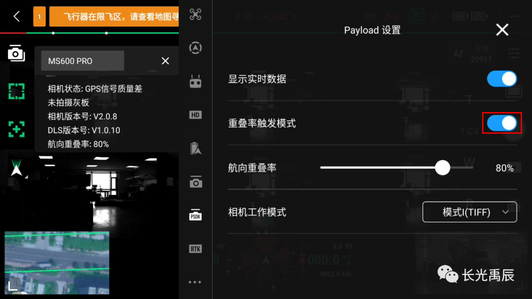 【3】若无人机使用双云台且同时使用其他载荷时,须将 MS600 Pro 挂载于2号云台上,且需打开Payload设置中“重叠度触发模式”,其他情况均无需打开该功能。