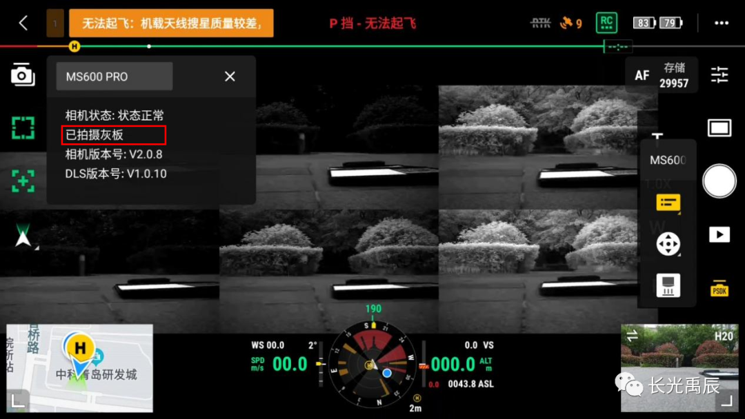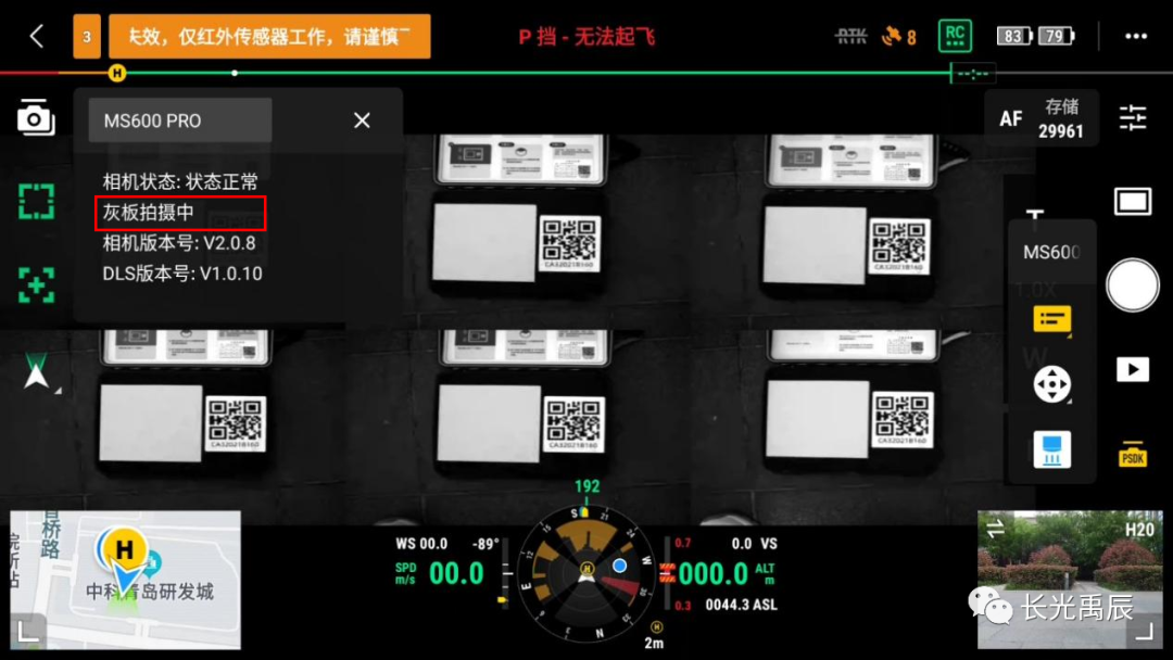 【4】航线规划完成后点击切换至MS600 Pro相机窗口进行灰板拍摄:将灰板放置平整地面,之后点击右侧“PSDK功能栏按钮” →“自动灰板拍摄按钮”,相机将进入自动灰板拍摄模式并自动调整镜头对地;