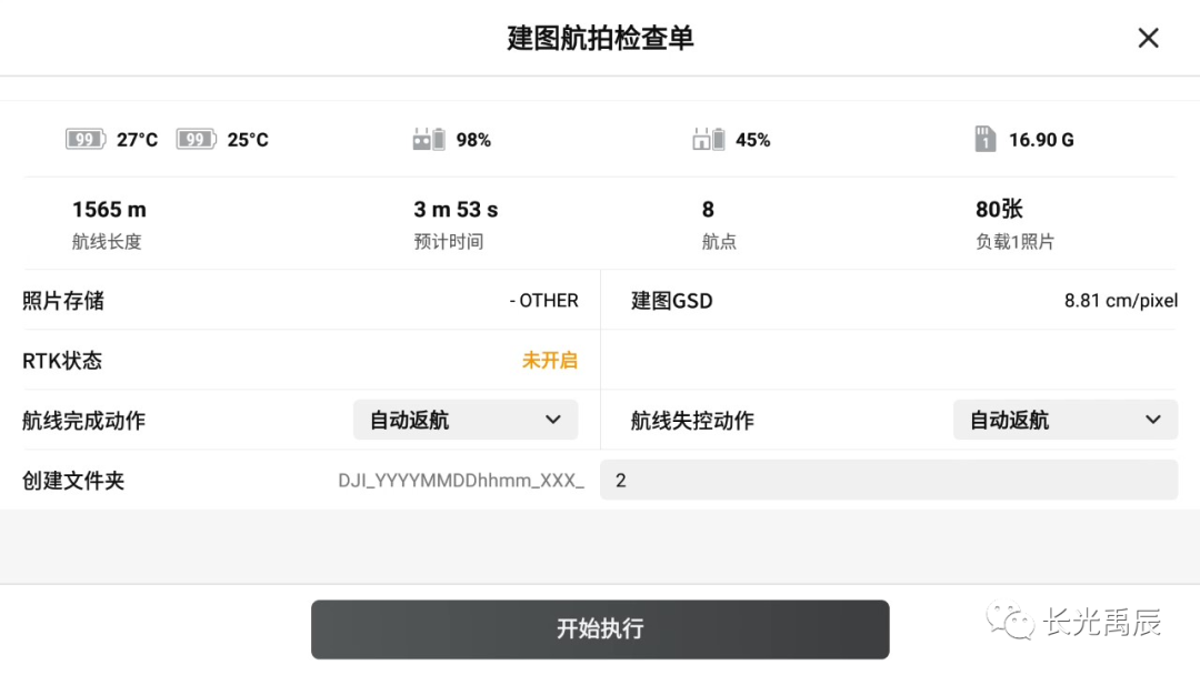 【5】点击左侧蓝色“起飞按钮”,飞行准备检查,完成后点击“开始执行”,飞机起飞,执行航线过程中可以预览查看到相机触发拍照的图像。