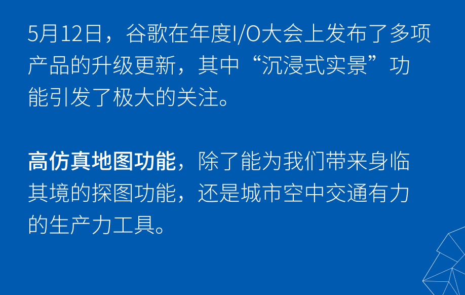 据介绍,此次“沉浸式实景”功能是拜目前计算机视觉与AI的进步所赐,将数十亿张街景与航空影像融合一起打造出来的,带来了极具真实感的实景体验。当2D的地图“跃升”至3D后,用户除了以往的查询路线以外,可以旋转视角查看建筑物之间,更好地了解城市的地形,并查看一天中不同时间下、不同天气下建筑的周边环境。