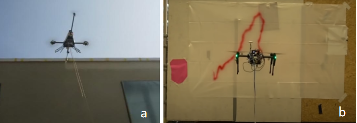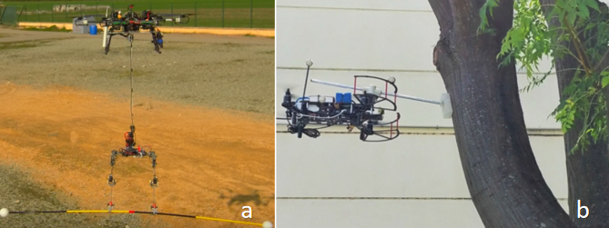 图 6 搬运 (a)塞维利亚大学利用空中作业机器人开发了一套远距离搬运系统[6];(b)西班牙塞维利亚大学的传感器部署机器人[7]