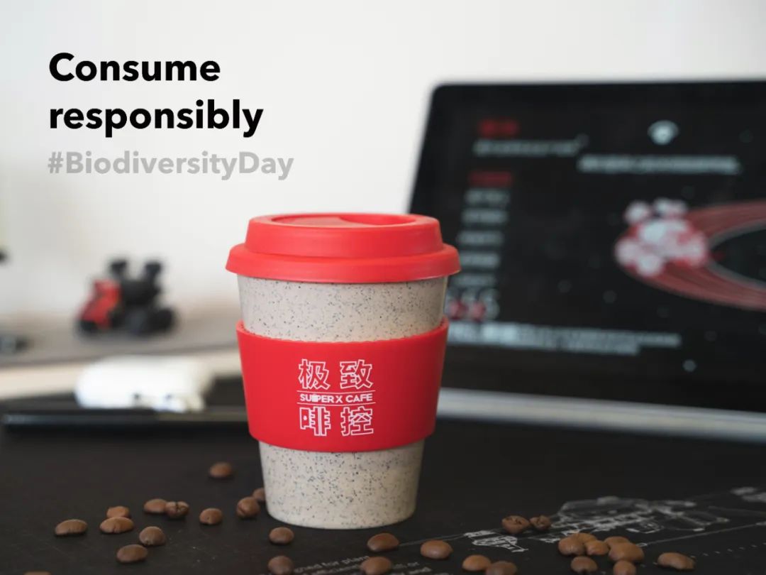 在极飞总部,我们建造了 Super X 咖啡厅,让员工享受咖啡休息时间,与同事交流。除了推广“自带杯子”的优惠,我们还设计了一个特殊的可重复使用的咖啡渣杯,鼓励员工养成负责任的消费习惯。( 2021 年,中国广州)22 项生物多样性行动之 8:节约能源