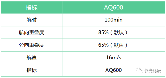 小型垂起固定翼遥感系统在进行AQ600多光谱相机单挂载时的飞行效率见如下表所示,飞行参数为默认飞行参数。