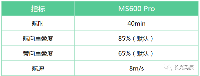 多旋翼遥感系统在进行MS600 Pro多光谱相机单挂载时的飞行效率如下表所示,飞行参数为默认飞行参数。
