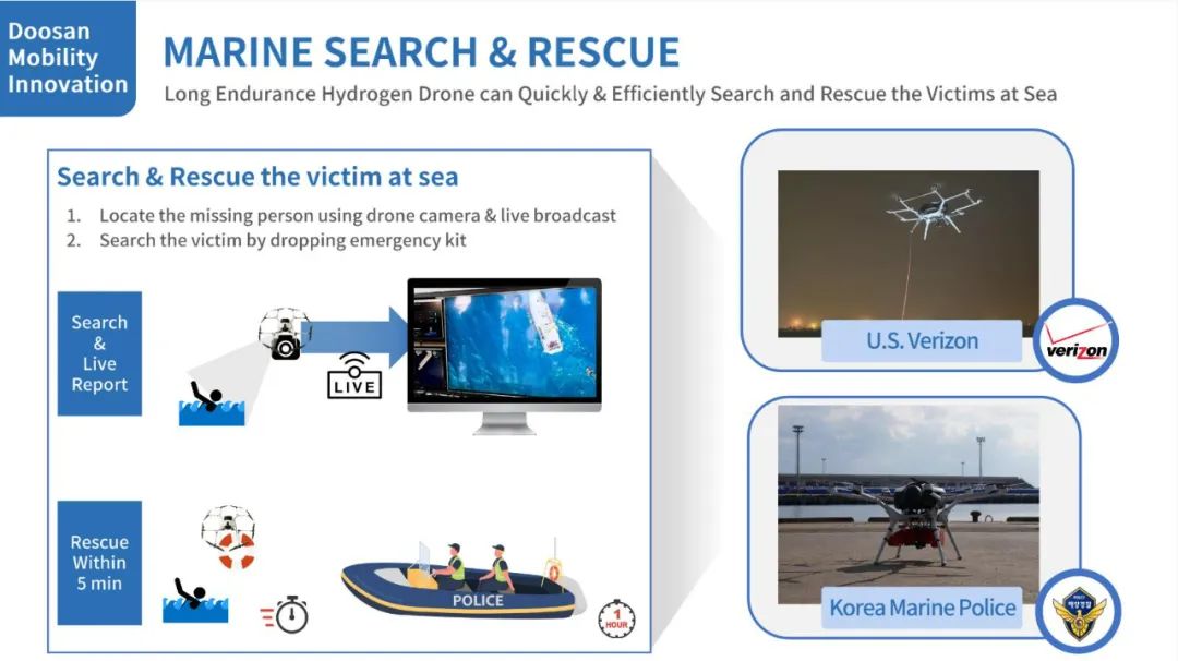 斗山创新开发的氢动力无人机广泛应用于海洋,陆地等各个场景,尤其是海洋领域的救援作业,岛屿配送作业,远海监控作业等。