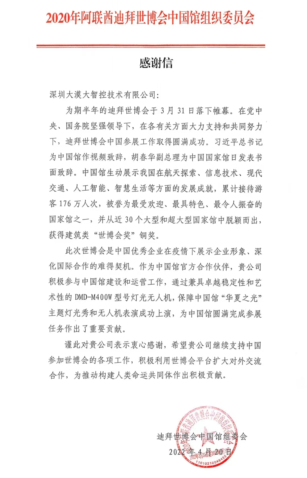 感谢信中特别指出:大漠大积极参与中国馆建设和运营工作,通过兼具卓越稳定性和艺术性的DMD-M400W型号灯光无人机,保障中国馆“华夏之光”主题灯光秀和无人机表演成功上演,为中国馆圆满完成参展任务作出了重要贡献。为期半年的迪拜世博会于3月31日落下帷幕。在党中央、国务院坚强领导下,在各有关方面大力支持和共同努力下,迪拜世博会中国参展工作取得圆满成功。习近平总书记为中国馆作视频致辞,胡春华副总理为中国国家馆日发表书面致辞。中国馆生动展示我国在航天探索、信息技术、现代交通、人工智能、智慧生活等方面的发展成就,累计接待游客176万人次,被誉为最受欢迎、最具特色、最令人振奋的国家馆之一,并从近30个大型和超大型国家馆中脱颖而出,获得建筑类“世博会奖”铜奖。