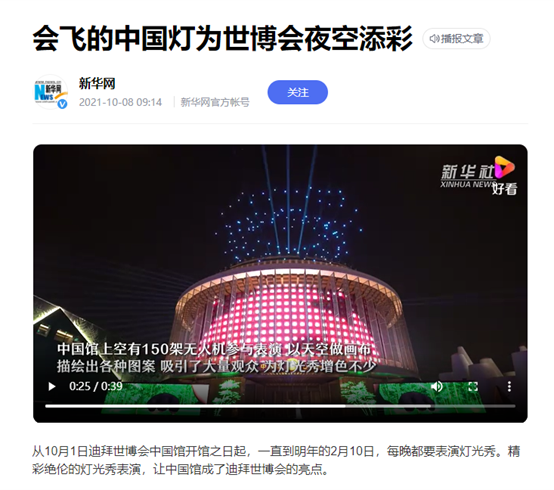 大漠大团队全程服务迪拜世博会中国馆作为中国无人机企业的优秀代表,大漠大以世博会契机走向世界舞台,向世界展现中国无人机企业的精湛技术和雄厚实力,以无人机编队表演形式讲好中国故事,传播中国文化,提升中国影响力。