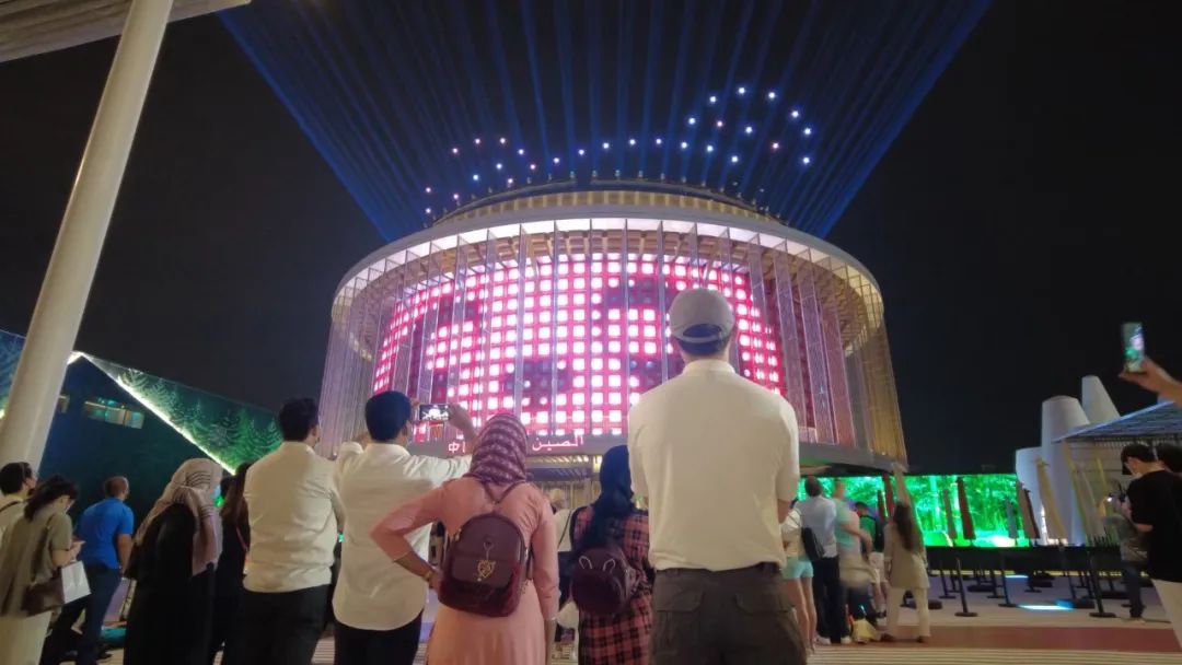 自2021年10月1日中国馆开馆以来,大漠大无人机编队表演进入常态化状态,每晚都会向各国游客奉献一场以科技力量与光影魅力相结合的“华夏之光”灯光秀表演,自亮相以来备受世界各地游客的喜爱,观看人数累计突破80万人次。