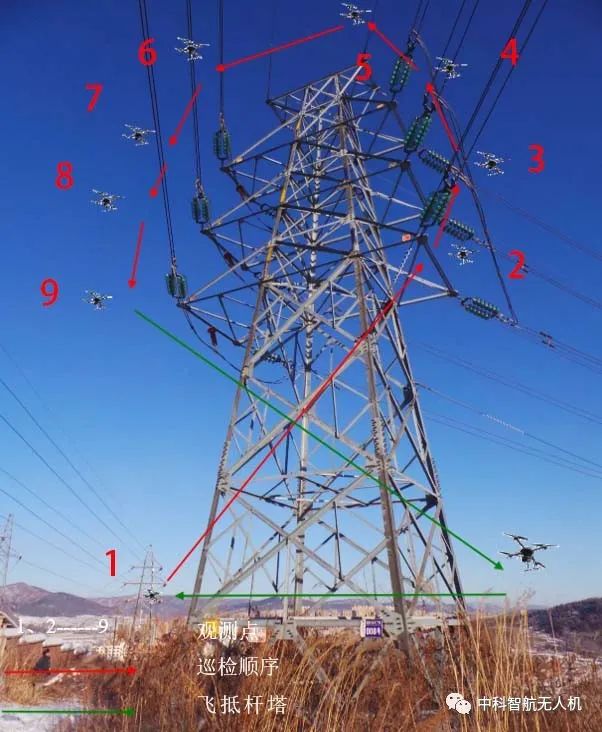 7)完成此杆塔巡检后,控制无人机远离线路,往下一基杆 塔继续巡检或返航。