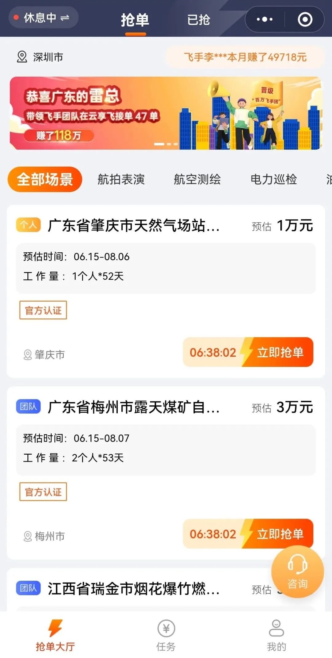 “除了有海量的飞行需求和提供飞手大量就业机会之外,在云飞手这个平台还有一个优势,就是可以到兄弟平台云仓去租用设备,那里有着市面上最新的机器,我就是靠着租机器去飞任务的”阿云说道。