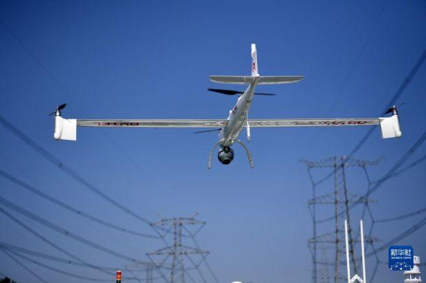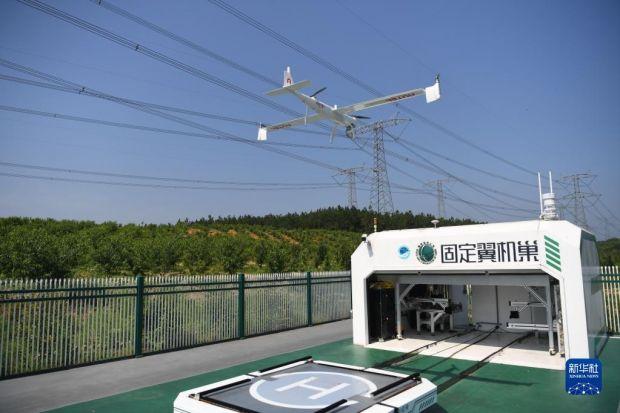 6月15日,在安徽省宣城市宣州区,一架固定翼无人机在自主巡检重要输电通道(无人机照片)。 垂直起降固定翼机巢是部署在输电线路附近地面上的固定机库,内部搭载一架依靠螺旋桨垂直起降、固定翼巡检飞行的无人机,机巢可自动收放无人机、更换电池、自主巡航周边环境等,从而实现重要输电通道无人值守的全自动智能巡检作业。 在安徽电网智能巡检管控中心,工作人员下达起飞指令,垂直起降固定翼巡检无人机就可以从远在200多公里外的无人机机巢起飞,执行对宣城宣广特高压密集通道线路的自主巡检任务。 新华社发(郑贤列 摄)