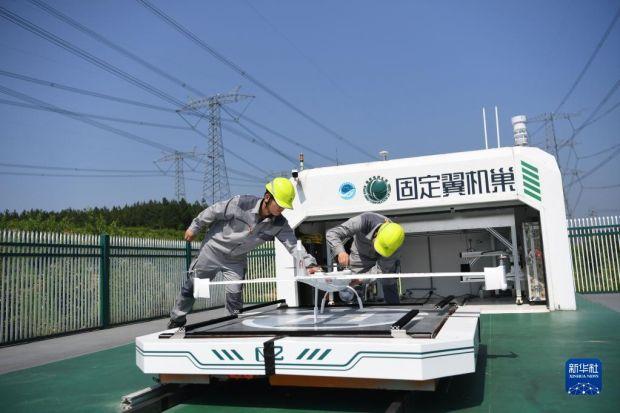 6月15日,一架巡检无人机从安徽省宣城市宣州区的一处机巢内起飞准备开展线路巡检。 垂直起降固定翼机巢是部署在输电线路附近地面上的固定机库,内部搭载一架依靠螺旋桨垂直起降、固定翼巡检飞行的无人机,机巢可自动收放无人机、更换电池、自主巡航周边环境等,从而实现重要输电通道无人值守的全自动智能巡检作业。 在安徽电网智能巡检管控中心,工作人员下达起飞指令,垂直起降固定翼巡检无人机就可以从远在200多公里外的无人机机巢起飞,执行对宣城宣广特高压密集通道线路的自主巡检任务。 新华社记者 刘军喜 摄