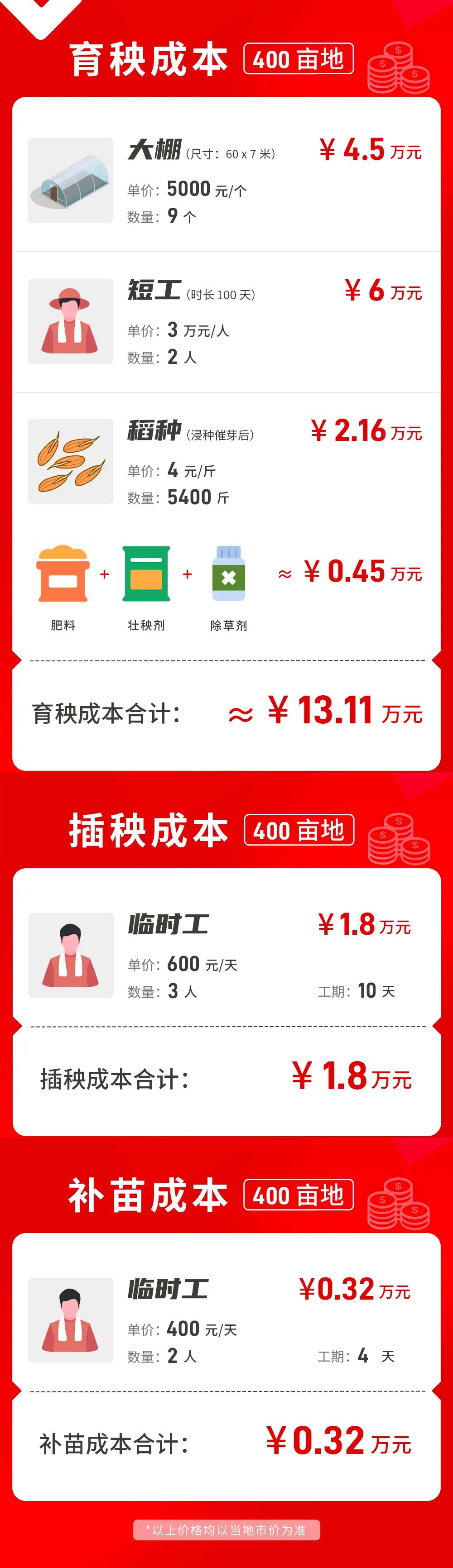 补苗场景整个育秧插秧持续近 50 天,流程多,过程繁复,能不能更省事呢?今年马哥就想到了使用农业无人机进行直播。“用极飞 P100 农业无人机直播轻松多了,只需要将浸种催芽好的稻种倒入无人机料箱中,在手机上进行简单的操作,无人机就能按照既定航线均匀、快速播下种子,减少了以前育秧、插秧、补苗多个环节,我今年一天就能播完我家的 400 亩地。”“相比插秧,无人机直播成本更低,今年省下近万元”对农户来说,传统的育秧插秧除了环节多,而且种植成本相对较高。特别是人工成本,“干农活太辛苦了,现在很多人不愿意做,人是越来越难请到的,价格也越来越高。几年前一个短工只要 1.5 万元一个人,现在都翻了一倍。”马哥为我们盘算了他育秧插秧过程所需要的各种成本: