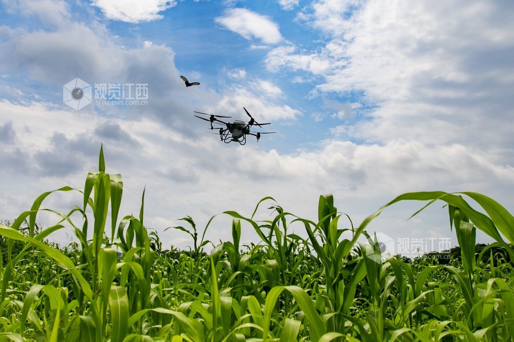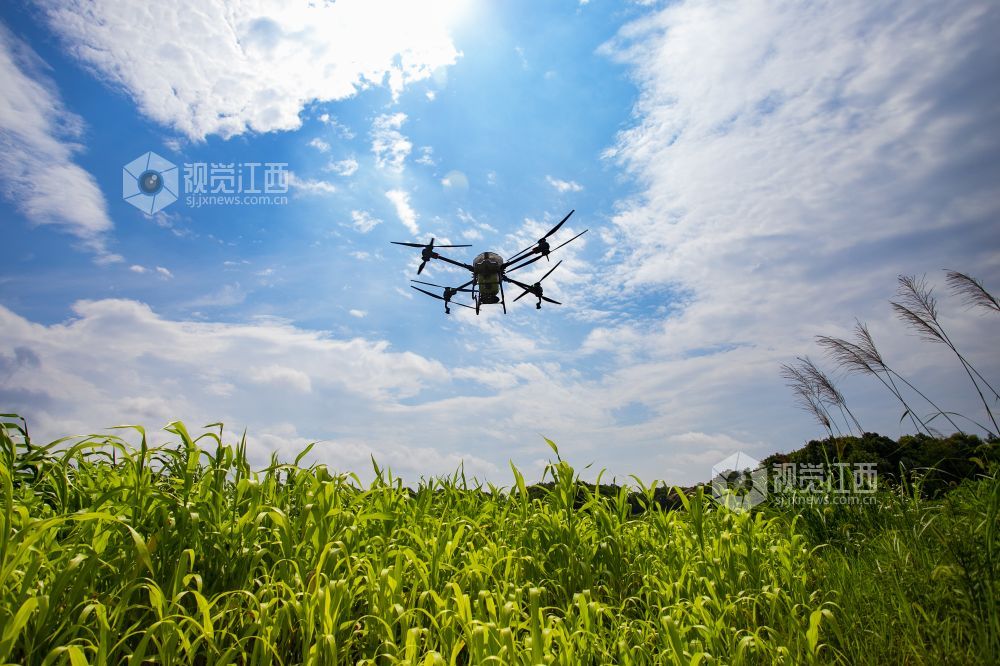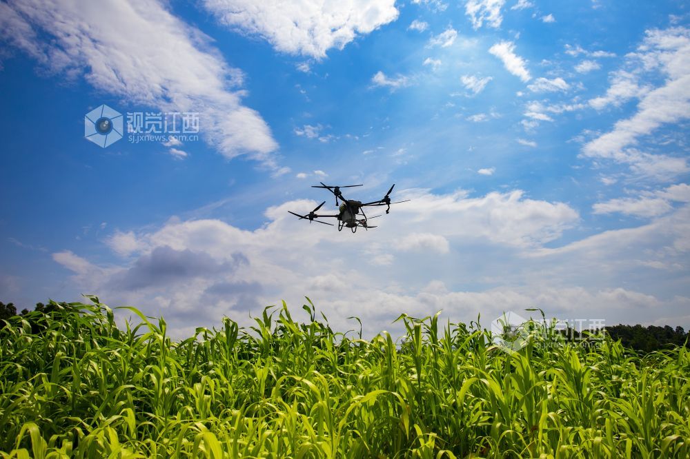 2022年6月23日,江西省九江市湖口县农技专员正在操作无人机给高粱施肥。