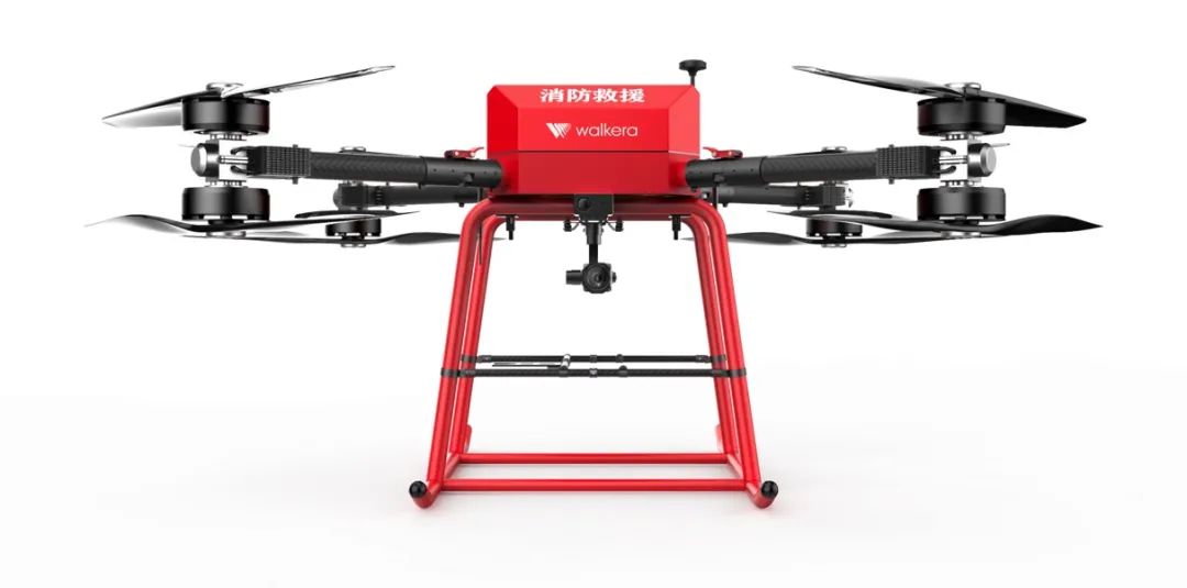 WK1900消防无人机采用四轴八电机设计,载重量大、抗风能力强、抛撒精度高,可以近距离喷洒灭火干粉。