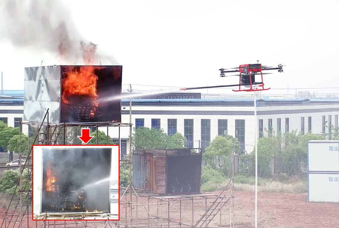 该无人机采用折叠机身设计,启动后能迅速抵达高层火场,支持挂载多种消防应用装备,利用高倍摄像机观察火势,精准开展灭火行动。
