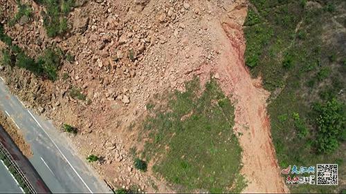 在现场,山体已经呈半裸状态,露出黄黄的泥土,不时还有泥土和树枝滑落,对道路抢通工作存在一定的影响。为尽快处理潜在危机,赣州公路发展中心信丰分中心迅速启动G105国道信丰绕城公路山体滑坡灾毁路面的清理抢修工作,多次出动无人机拍摄协助清理抢修,全方位精准研判塌方点有关情况,时时传图进行第一时间对塌方点做出抢通方案,提高抢修效率也为抢修方案的制定提供科学依据,抢出清理“加速度”。