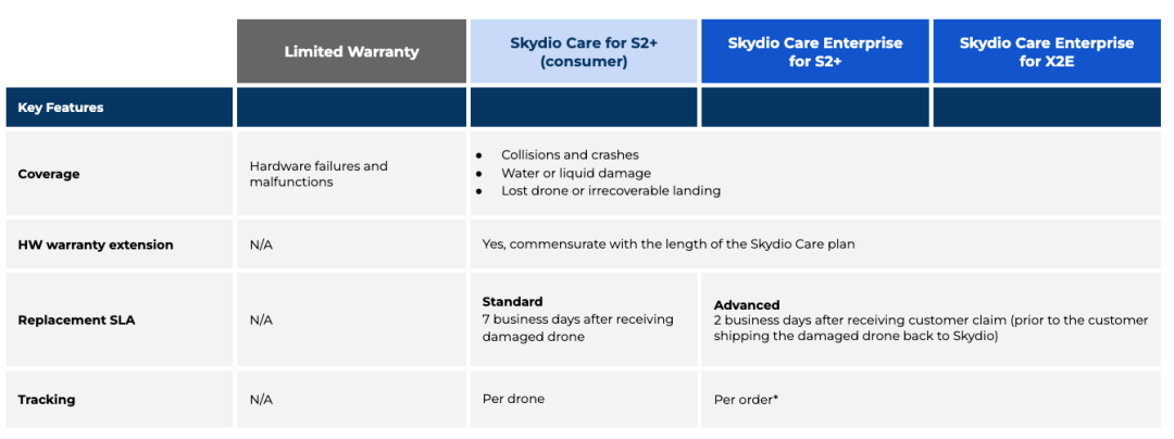 这里有一份数据表,提供了关于Skydio Care无人机保险计划不同方面的更多细节: