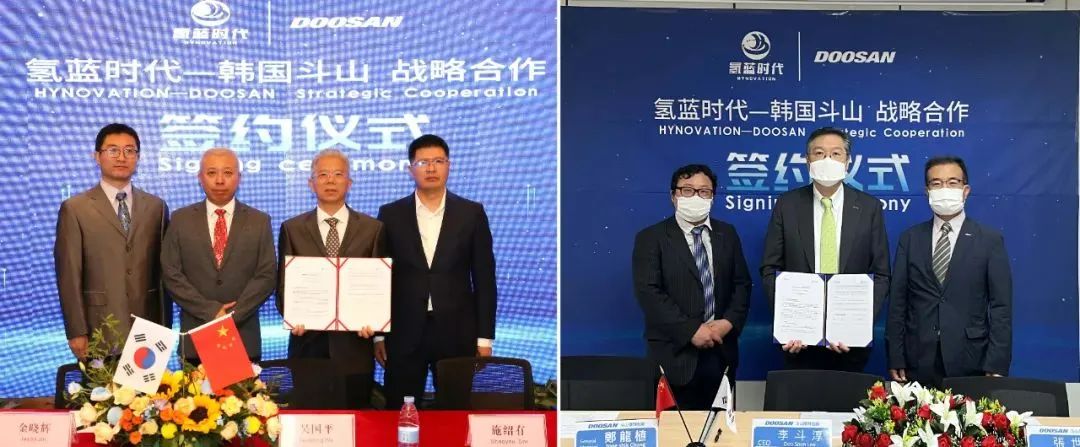 6月24日下午,氢蓝时代与斗山创新分别在中国深圳和韩国龙仁,通过线上视频的方式举行了战略合作签约仪式。这是斗山创新首次与国内氢燃料电池龙头企业牵手,双方将在超轻量化移动式燃料电池系统、氢能发电和储能市场开拓、应用场景打造和全球市场推广等方面启动全面战略合作。韩国斗山创新CEO李斗淳、CTO张世东,氢蓝时代董事长金晓辉等领导出席了签约仪式。