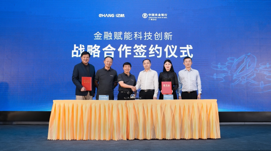 亿航智能创始人、董事长兼首席执行官胡华智,首席运营官方鑫与农行广东分行副行长、广州分行行长李大龙,广州天河支行行长彭伟明出席仪式,亿航智能首席财务官刘剑与农行广州分行副行长李美佳代表双方签订战略合作协议。