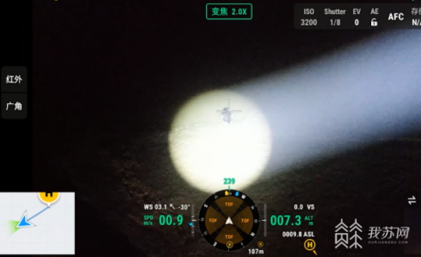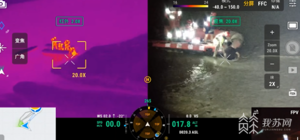 随后,连云港市消防救援支队全勤指挥部人员赶到了现场,根据现场民警的描述,决定利用无人机开展热成像侦查精准定位受困人员,助力救援行动。应急通信保障分队队员操作M300无人机开展热成像侦查,根据民警指引方位,开启无人机照明、切换变焦镜头对热源进行确认,通过无人机H20n变焦画面清晰锁定了被困人员的位置,整个侦查过程仅用时不到1分钟。在确认被困男子的位置后,通过激光打点记录被困人员位置,并汇报给现场指挥部。