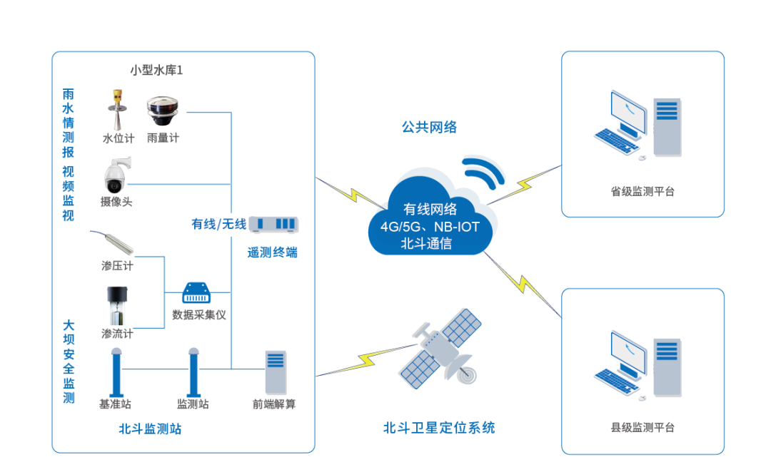 司南导航小型水库雨水情测报、大坝安全监测解决方案,通过GNSS设备、渗压计、雨量计等感知设备,实时捕捉降水量变化、毫米级感知水库大坝形变等各项数据,实现渗流量、渗流压力、表面位移等要素的快速准确测量。